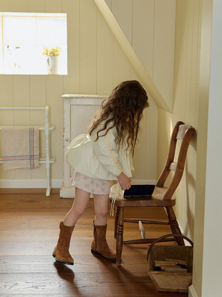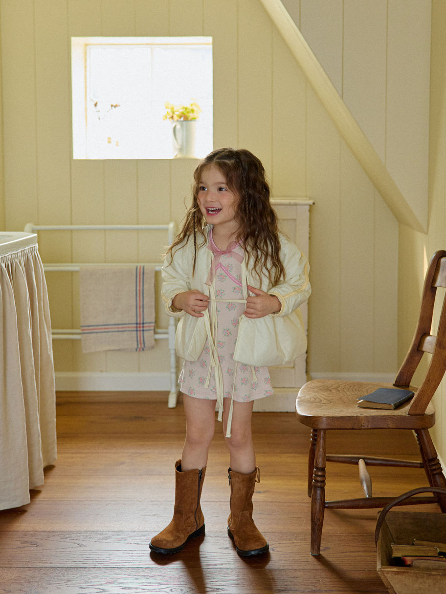 Delicately crafted from soft ribbed fabric adorned with a charming floral print, this mini-length dress captures the essence of sweet, timeless style. Thoughtful details like pearlescent trim, graceful front seams, and a sheer ribbon accent at the center lend an air of elegance and gentle femininity—perfect for your little one’s special moments. This dress is made from 95% cotton and 5% spandex - very comfy stretchy!